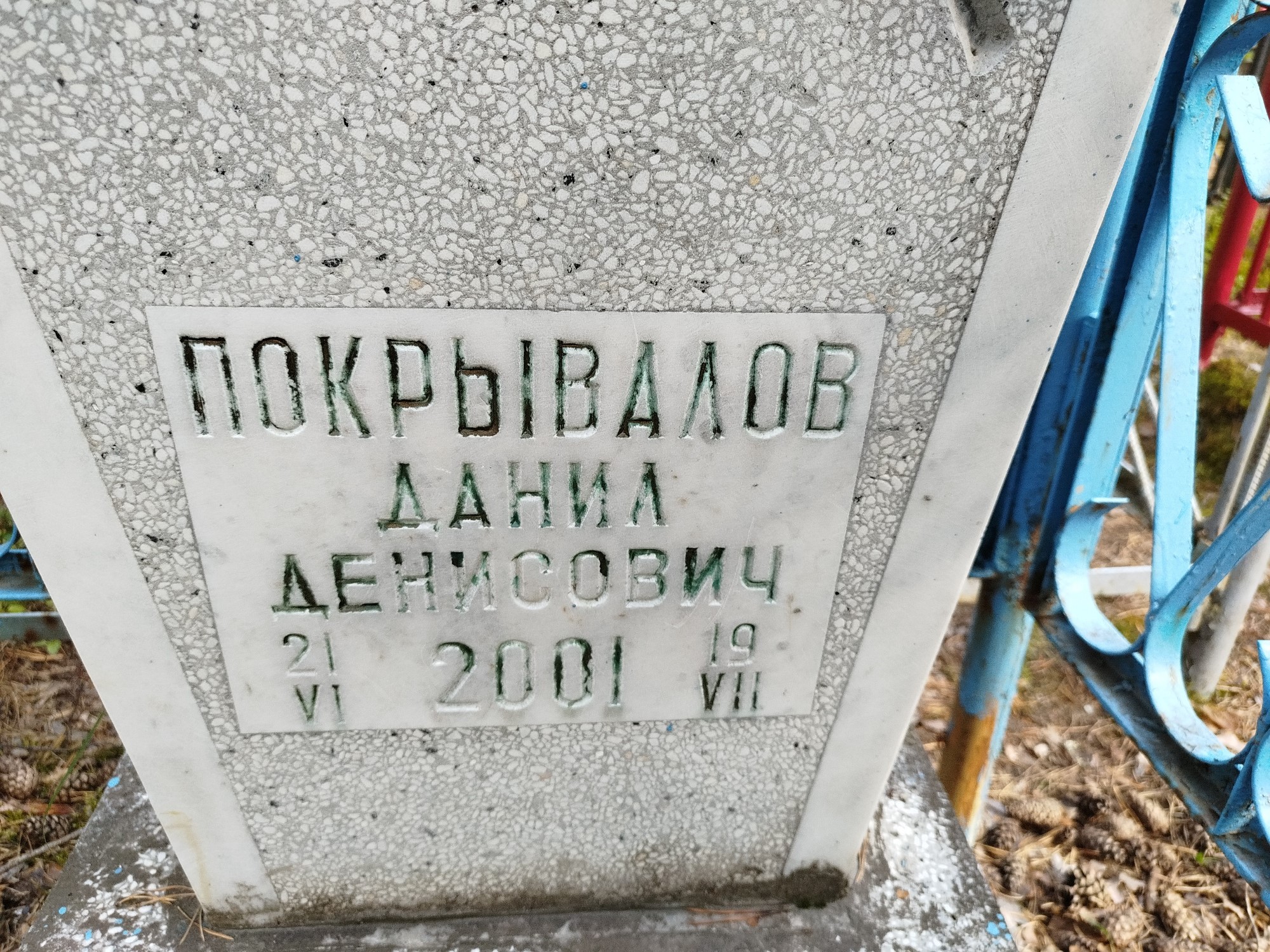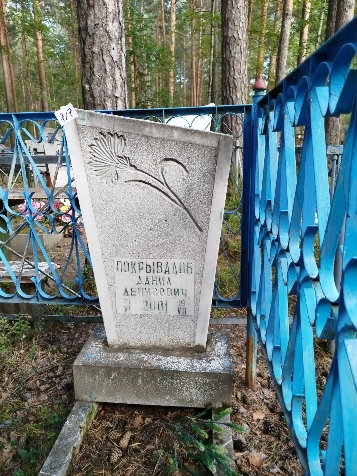Дата рождения: 21.06.2001 Дата смерти: 19.07.2001 Наличие ограды: Нет Кладбище: Чернореченское Секция кладбища: Номер ряда: 1 Номер захоронения: 727 Вид захоронения: В землю Координаты: