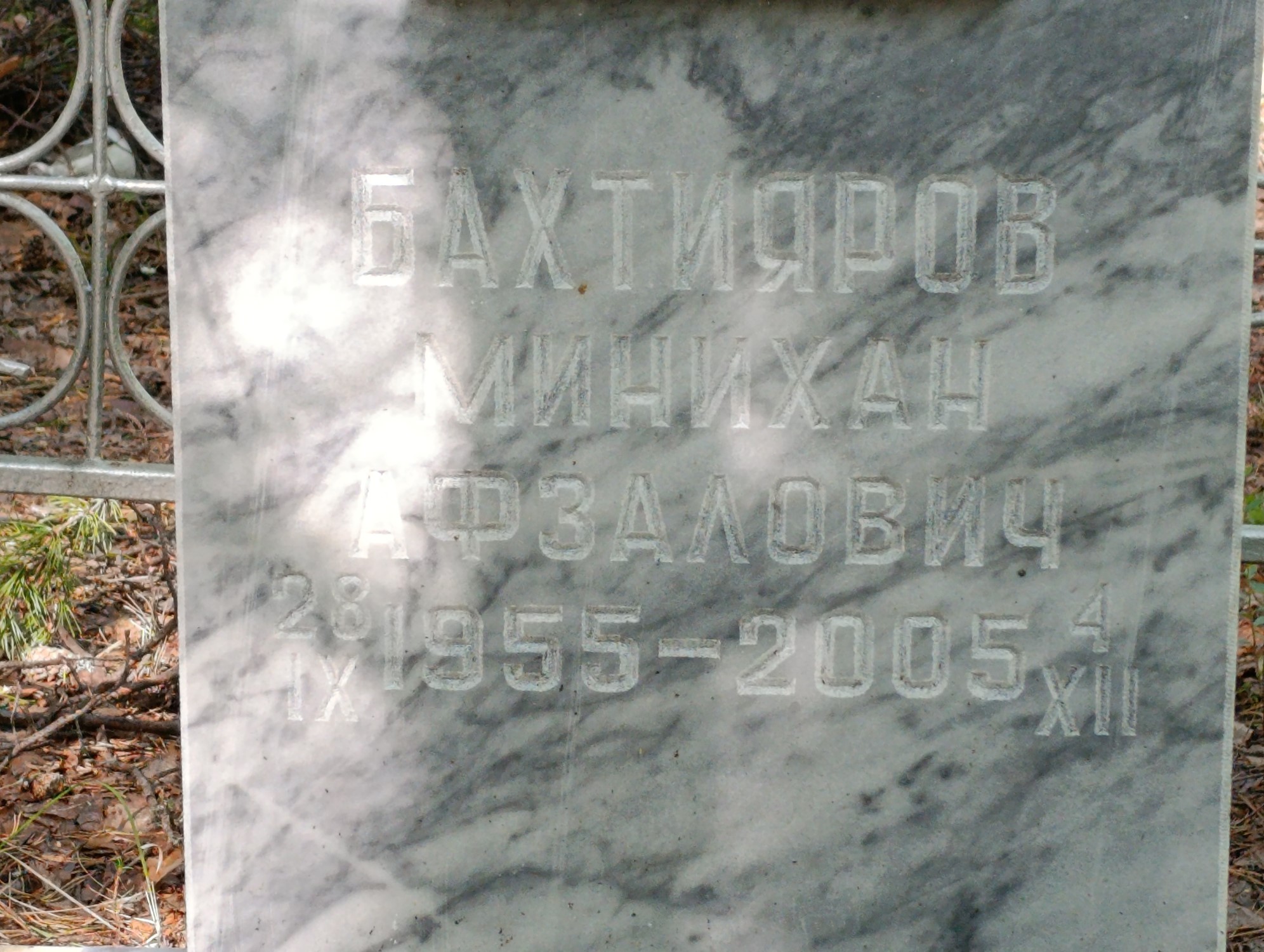 Дата рождения: 28.09.1955 Дата смерти: 04.12.2005 Наличие ограды: Нет Кладбище: Чернореченское Секция кладбища: 2_Мусульманские захоронения Номер ряда: 1 Номер захоронения: 165 Вид захоронения: В землю Координаты: