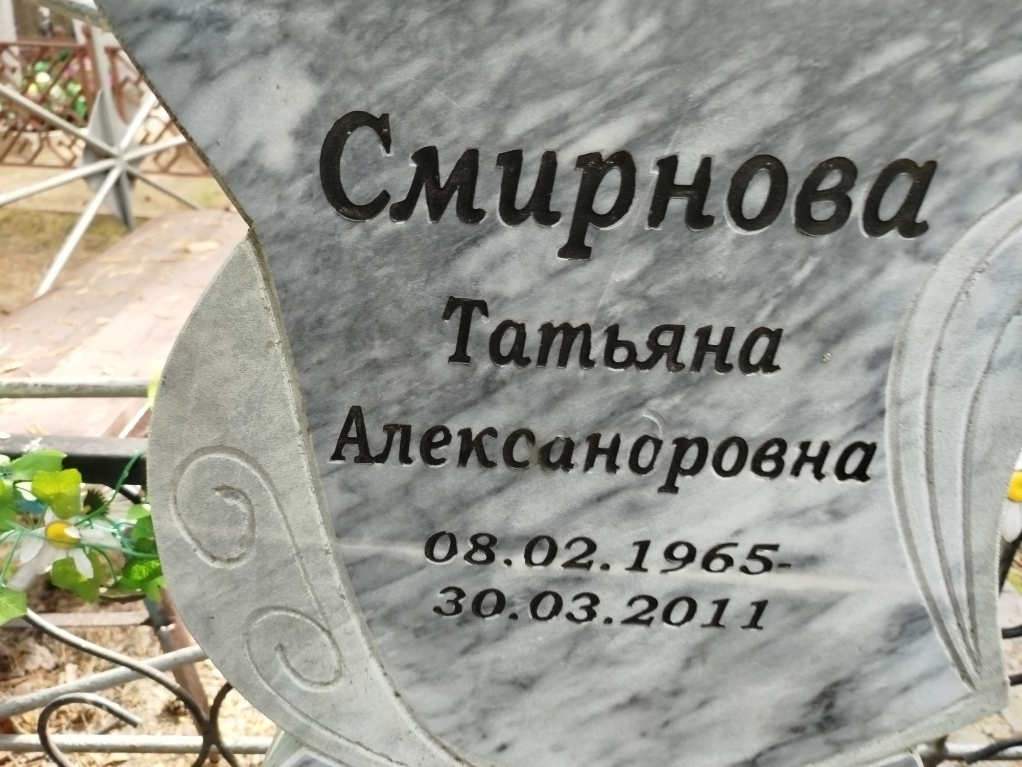 Дата рождения: 08.02.1965 Дата смерти: 30.03.2011 Наличие ограды: Нет Кладбище: Чернореченское Секция кладбища: Номер ряда: 1 Номер захоронения: 1159 Вид захоронения: В землю Координаты: