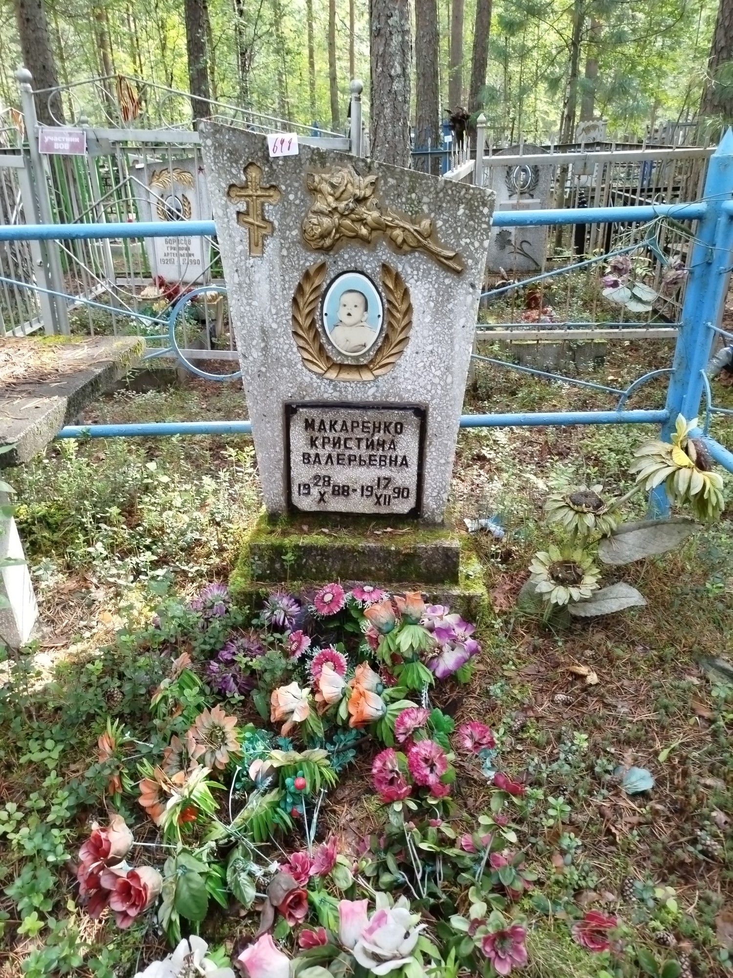 Дата рождения: 28.10.1988 Дата смерти: 17.12.1990 Наличие ограды: Нет Кладбище: Чернореченское Секция кладбища: 3 Номер ряда: 1 Номер захоронения: 648 Вид захоронения: В землю Координаты: