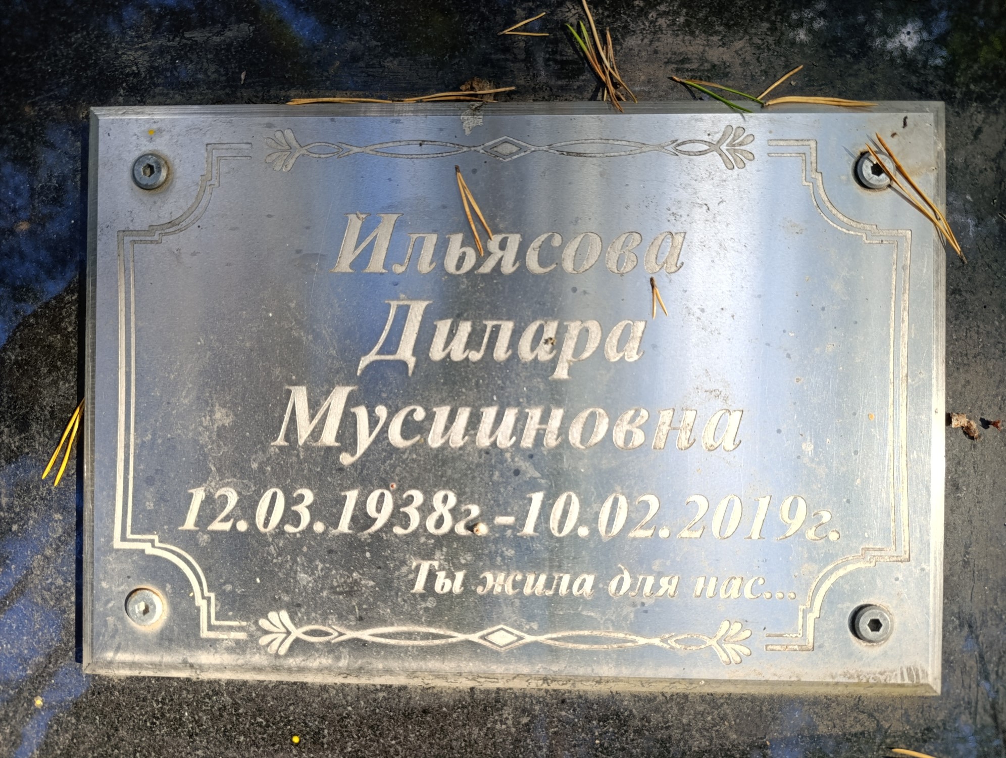 Дата рождения: 12.03.1938 Дата смерти: 10.02.2019 Наличие ограды: Нет Кладбище: Чернореченское Секция кладбища: 2_Мусульманские захоронения Номер ряда: 1 Номер захоронения: 621 Вид захоронения: В землю Координаты: