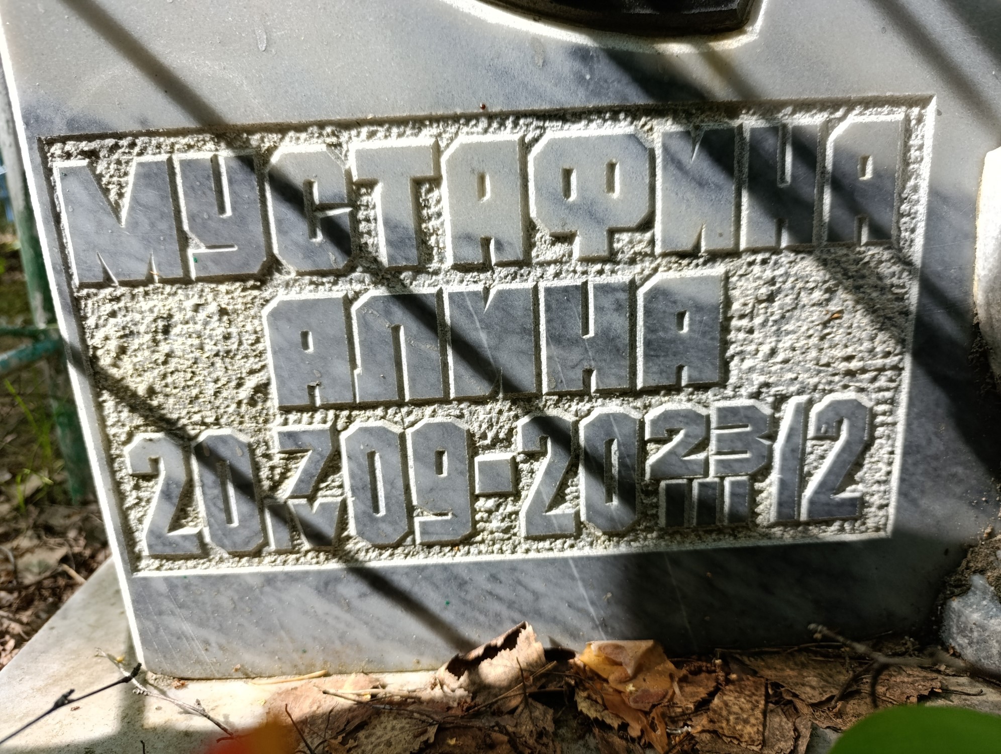 Дата рождения: 07.04.2009 Дата смерти: 23.03.2012 Наличие ограды: Нет Кладбище: Чернореченское Секция кладбища: 2_Мусульманские захоронения Номер ряда: 1 Номер захоронения: 522 Вид захоронения: В землю Координаты: