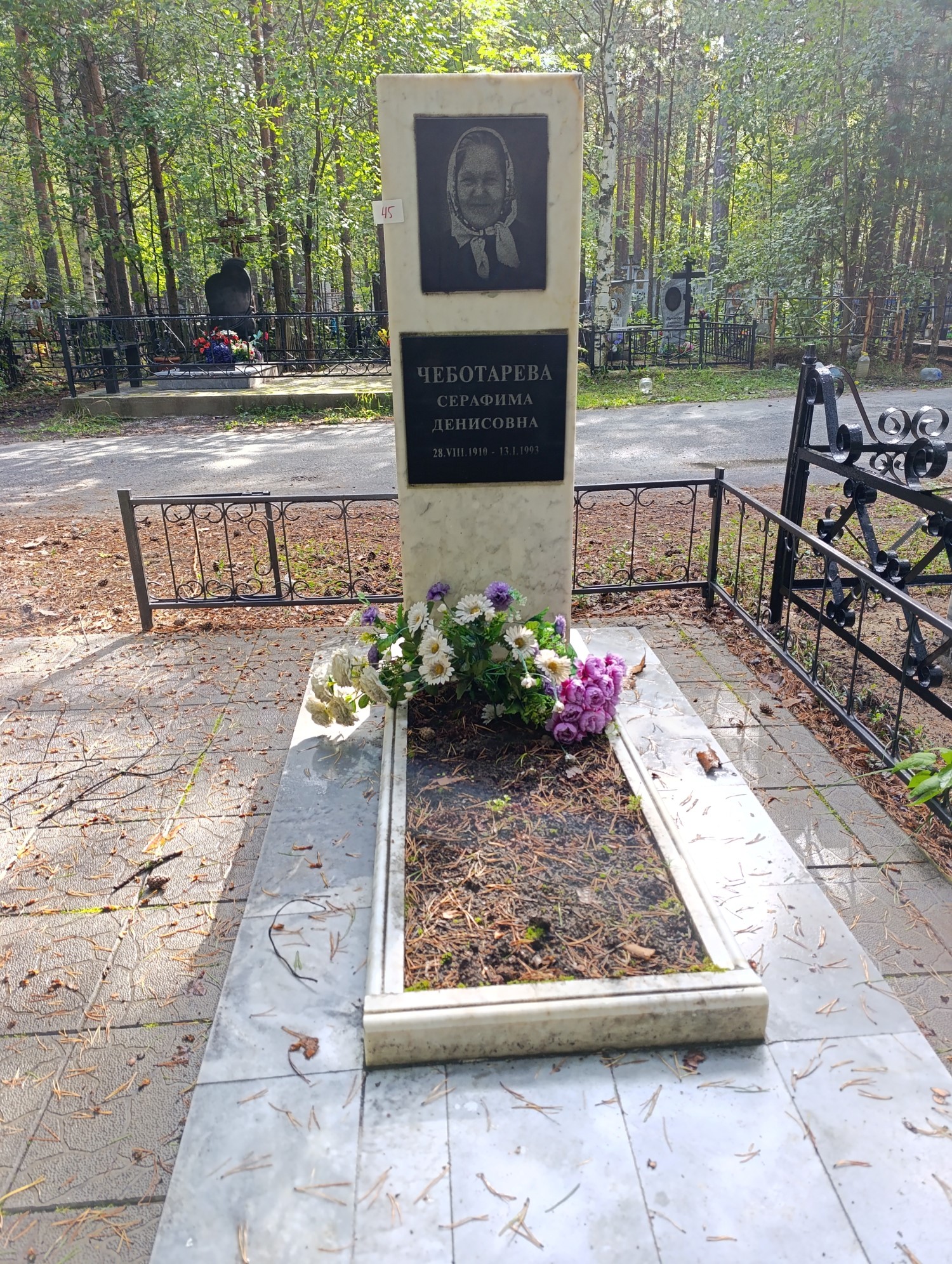 Дата рождения: 28.08.1910 Дата смерти: 13.01.1993 Наличие ограды: Нет Кладбище: Чернореченское Секция кладбища: 4 Номер ряда: 1 Номер захоронения: 45 Вид захоронения: В землю Координаты:
