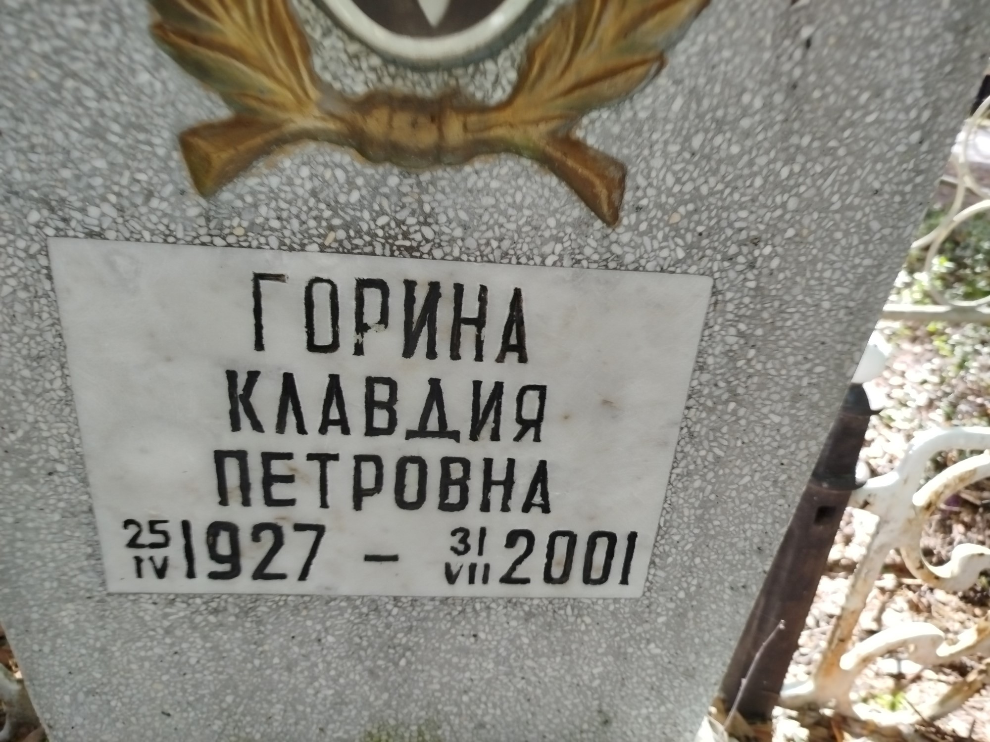 Дата рождения: 25.04.1927 Дата смерти: 31.07.2001 Наличие ограды: Нет Кладбище: Чернореченское Секция кладбища: Номер ряда: 1 Номер захоронения: 1114 Вид захоронения: В землю Координаты: