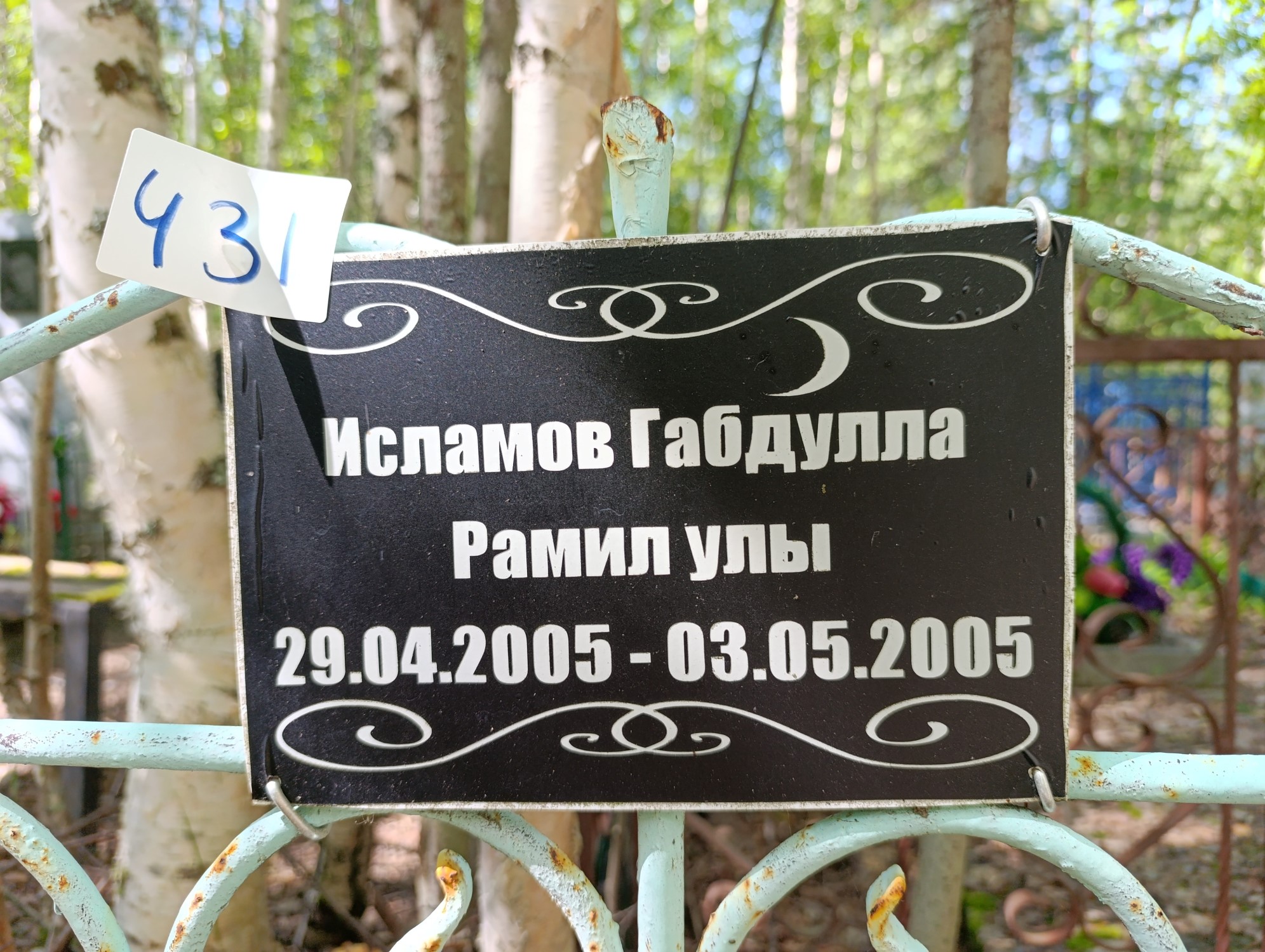Дата рождения: 29.04.2005 Дата смерти: 03.05.2005 Наличие ограды: Нет Кладбище: Чернореченское Секция кладбища: 2_Мусульманские захоронения Номер ряда: 1 Номер захоронения: 431 Вид захоронения: В землю Координаты: