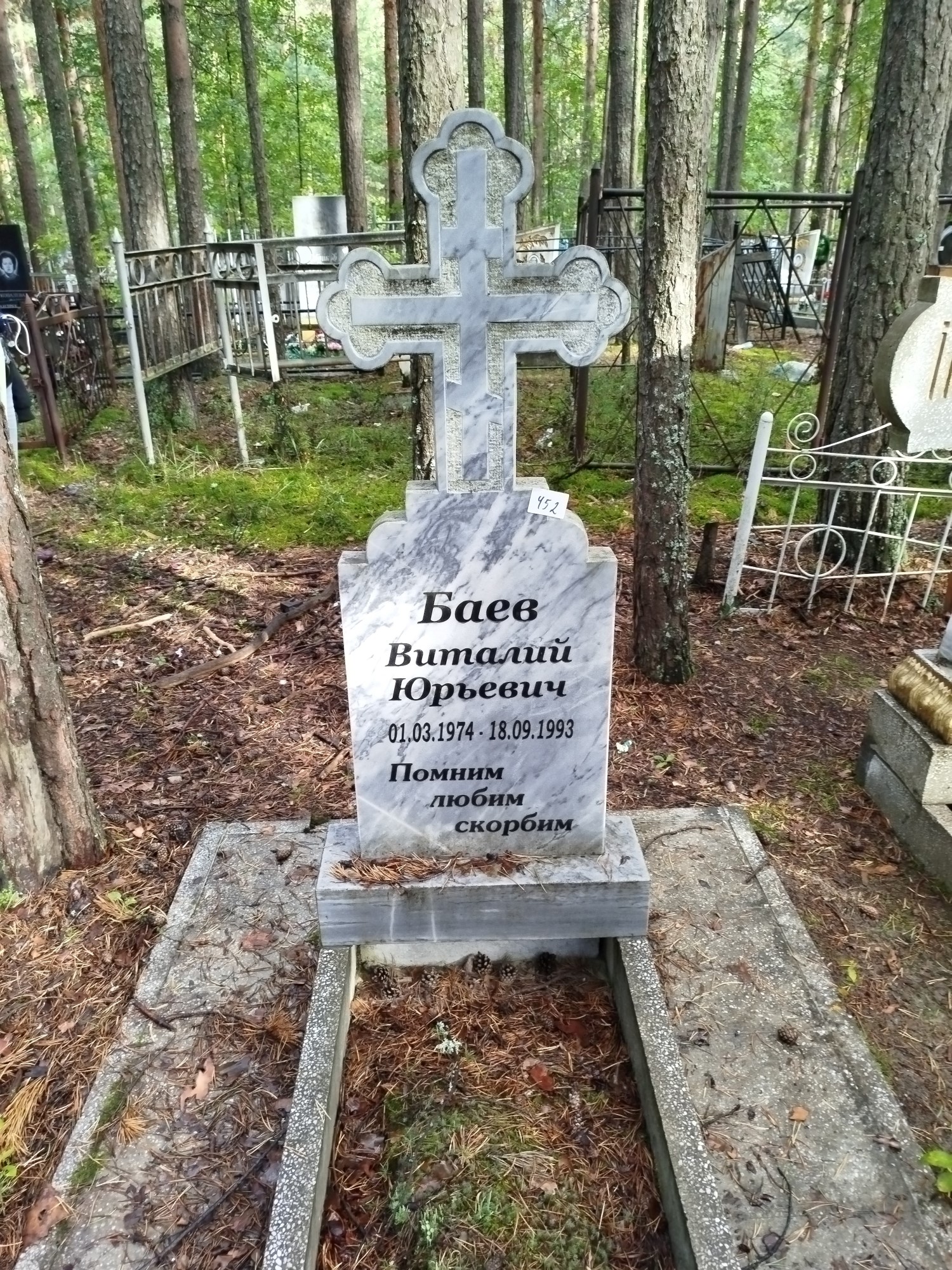 Дата рождения: 01.03.1974 Дата смерти: 18.09.1993 Наличие ограды: Нет Кладбище: Чернореченское Секция кладбища: 3 Номер ряда: 1 Номер захоронения: 452 Вид захоронения: В землю Координаты: