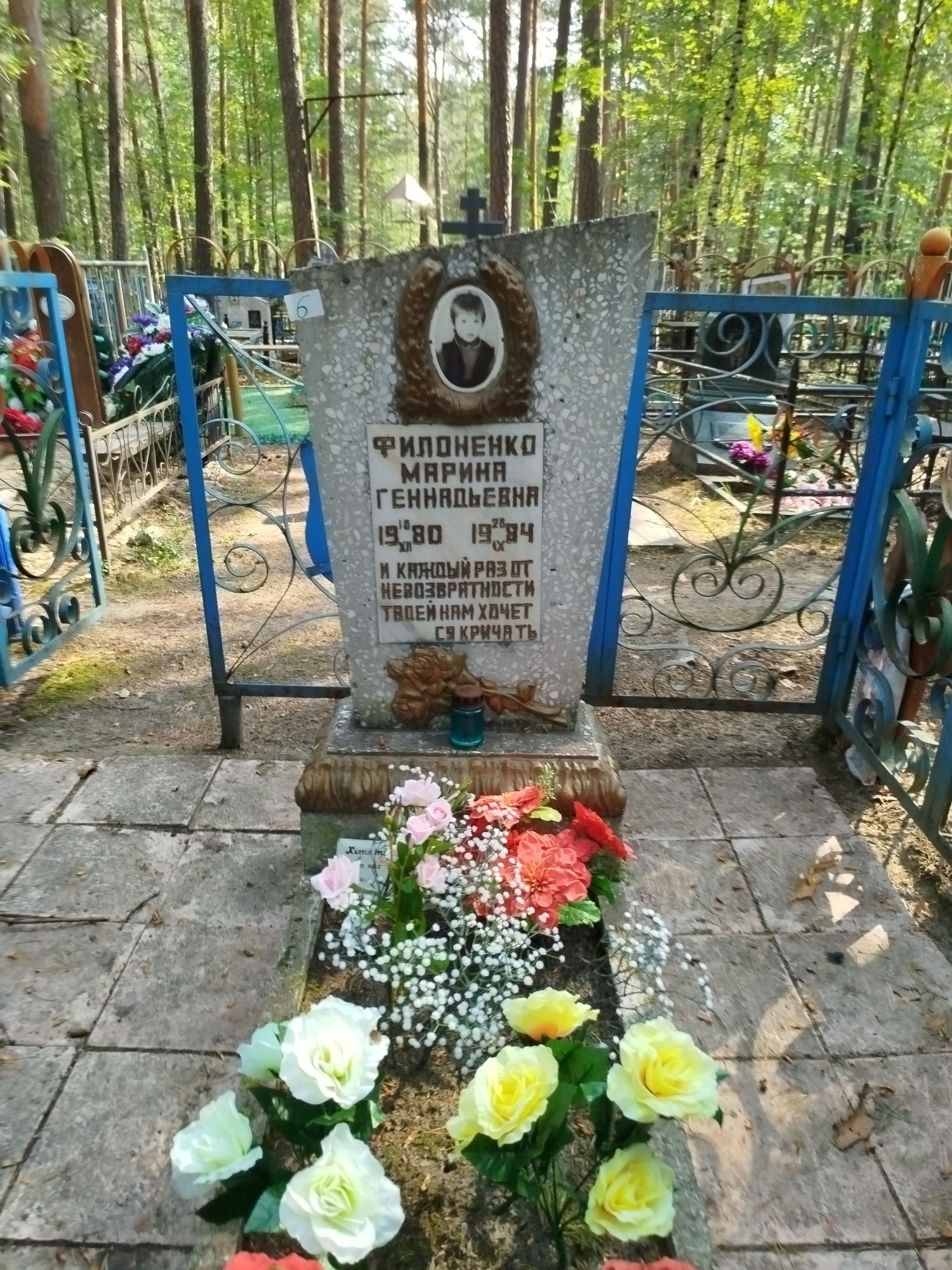 Дата рождения: 10.12.1980 Дата смерти: 28.09.1984 Наличие ограды: Нет Кладбище: Чернореченское Секция кладбища: Номер ряда: 1 Номер захоронения: 6 Вид захоронения: В землю Координаты: