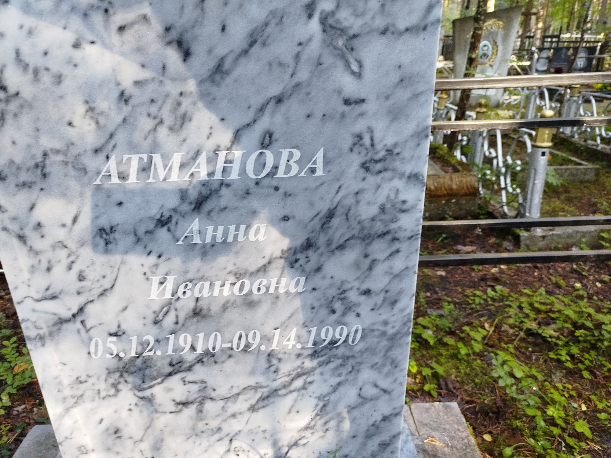 Дата рождения: 05.12.1910 Дата смерти: 14.09.1990 Наличие ограды: Нет Кладбище: Чернореченское Секция кладбища: 3 Номер ряда: 1 Номер захоронения: 517 Вид захоронения: В землю Координаты: