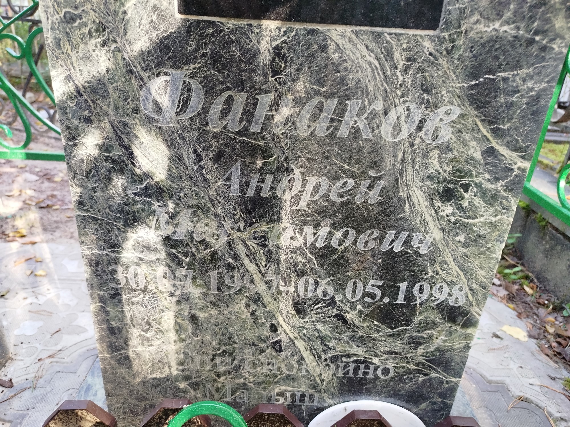 Дата рождения: 30.07.1997 Дата смерти: 06.05.1998 Наличие ограды: Нет Кладбище: Чернореченское Секция кладбища: 1 Номер ряда: 1 Номер захоронения: 1153 Вид захоронения: В землю Координаты: