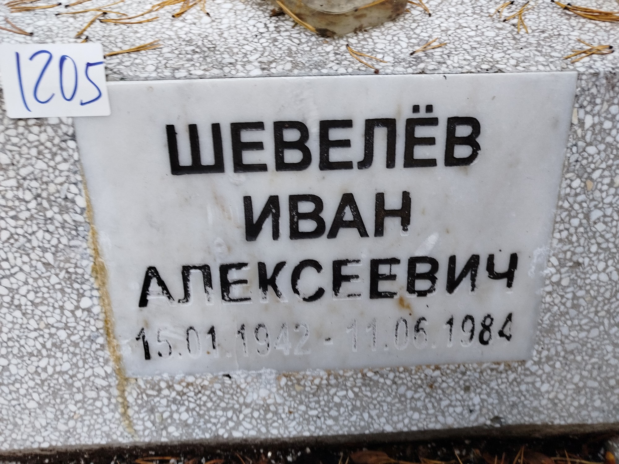 Дата рождения: 15.01.1942 Дата смерти: 11.06.1984 Наличие ограды: Нет Кладбище: Чернореченское Секция кладбища: 1 Номер ряда: 1 Номер захоронения: 1205 Вид захоронения: В землю Координаты: