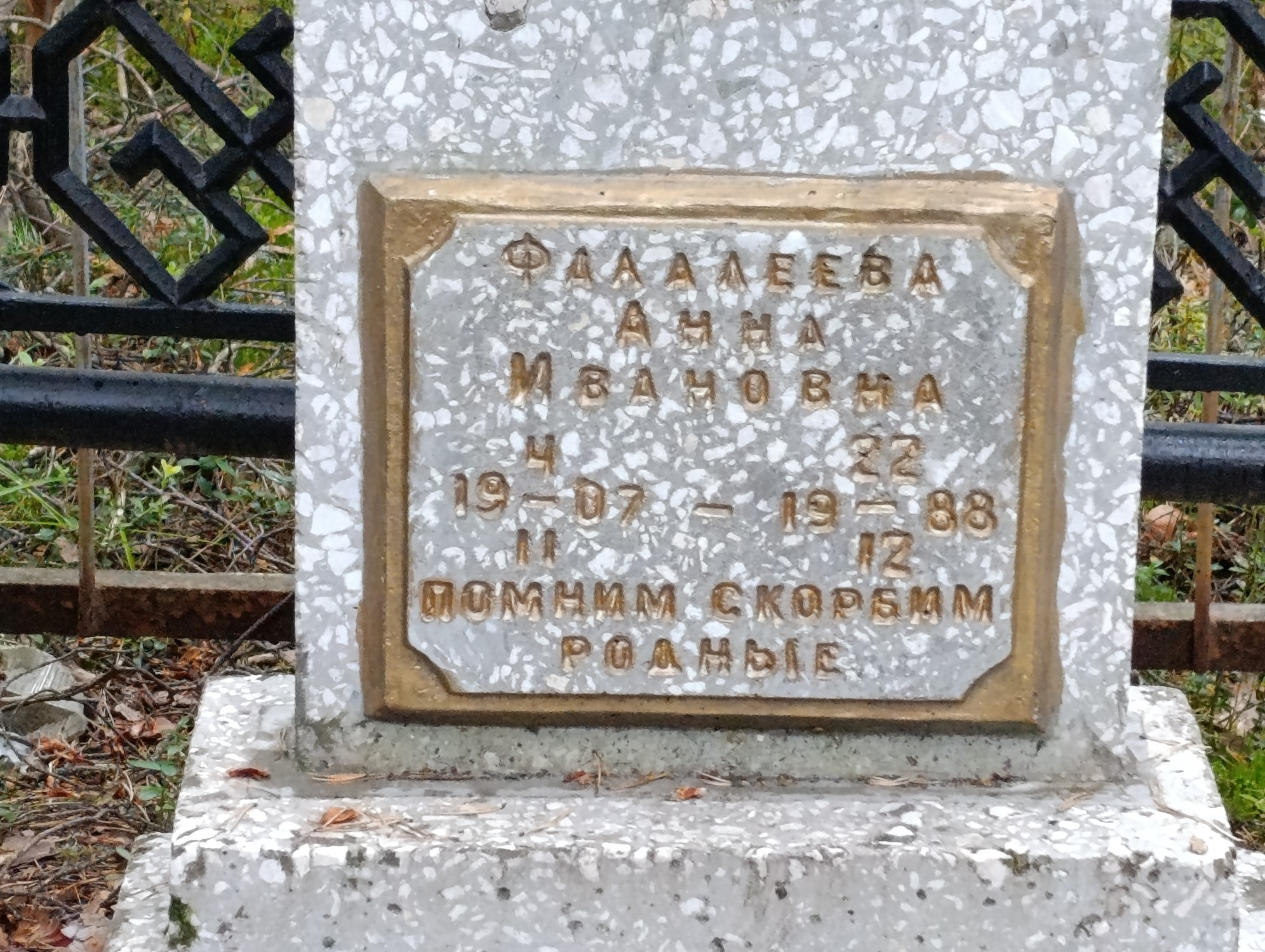 Дата рождения: 04.11.1907 Дата смерти: 22.12.1988 Наличие ограды: Нет Кладбище: Чернореченское Секция кладбища: 2 Номер ряда: 1 Номер захоронения: 2306 Вид захоронения: В землю Координаты: