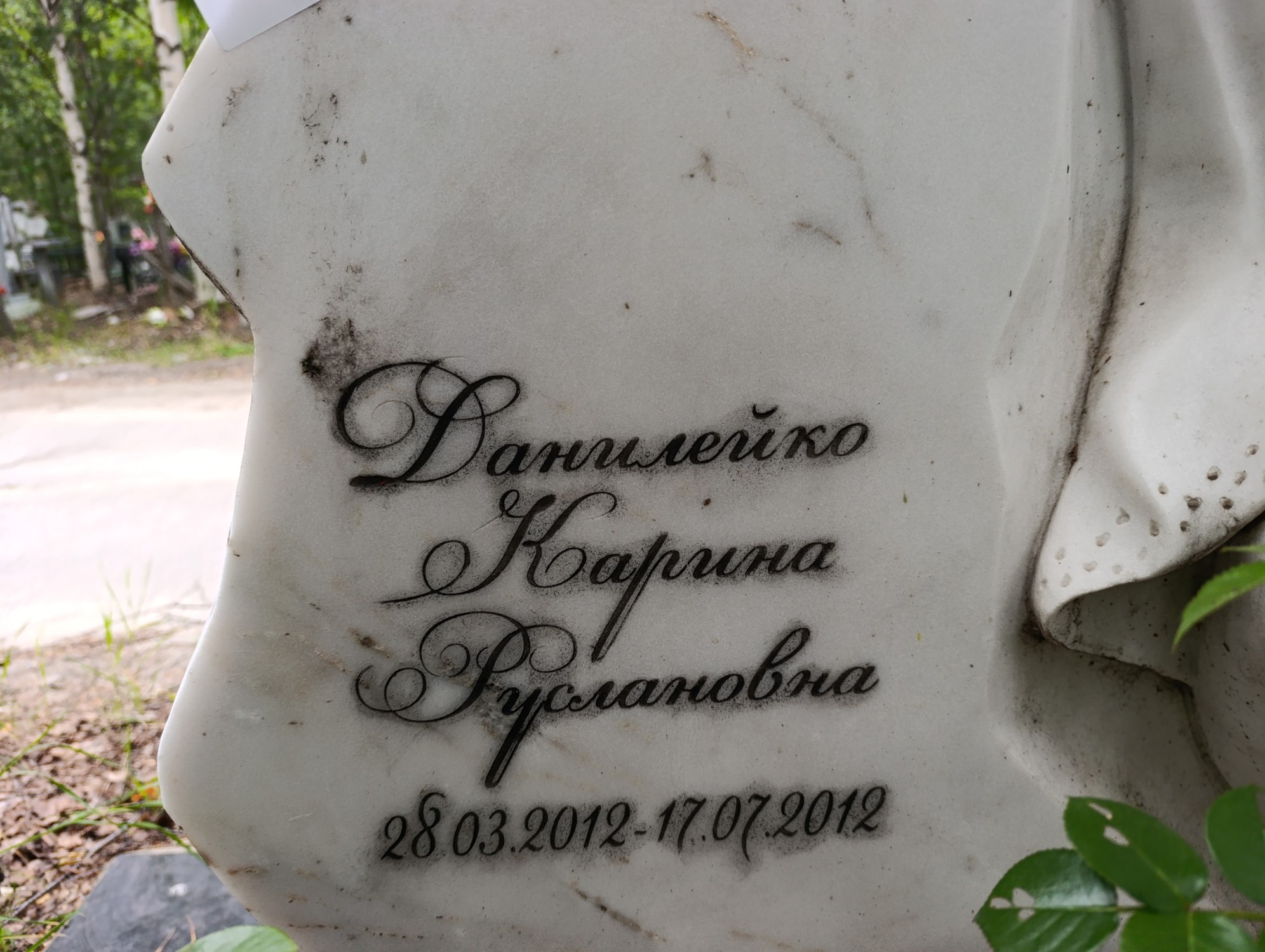Дата рождения: 28.03.2012 Дата смерти: 17.07.2012 Наличие ограды: Нет Кладбище: Чернореченское II этап Секция кладбища: 6 Номер ряда: 1 Номер захоронения: 8 Вид захоронения: В землю Координаты: