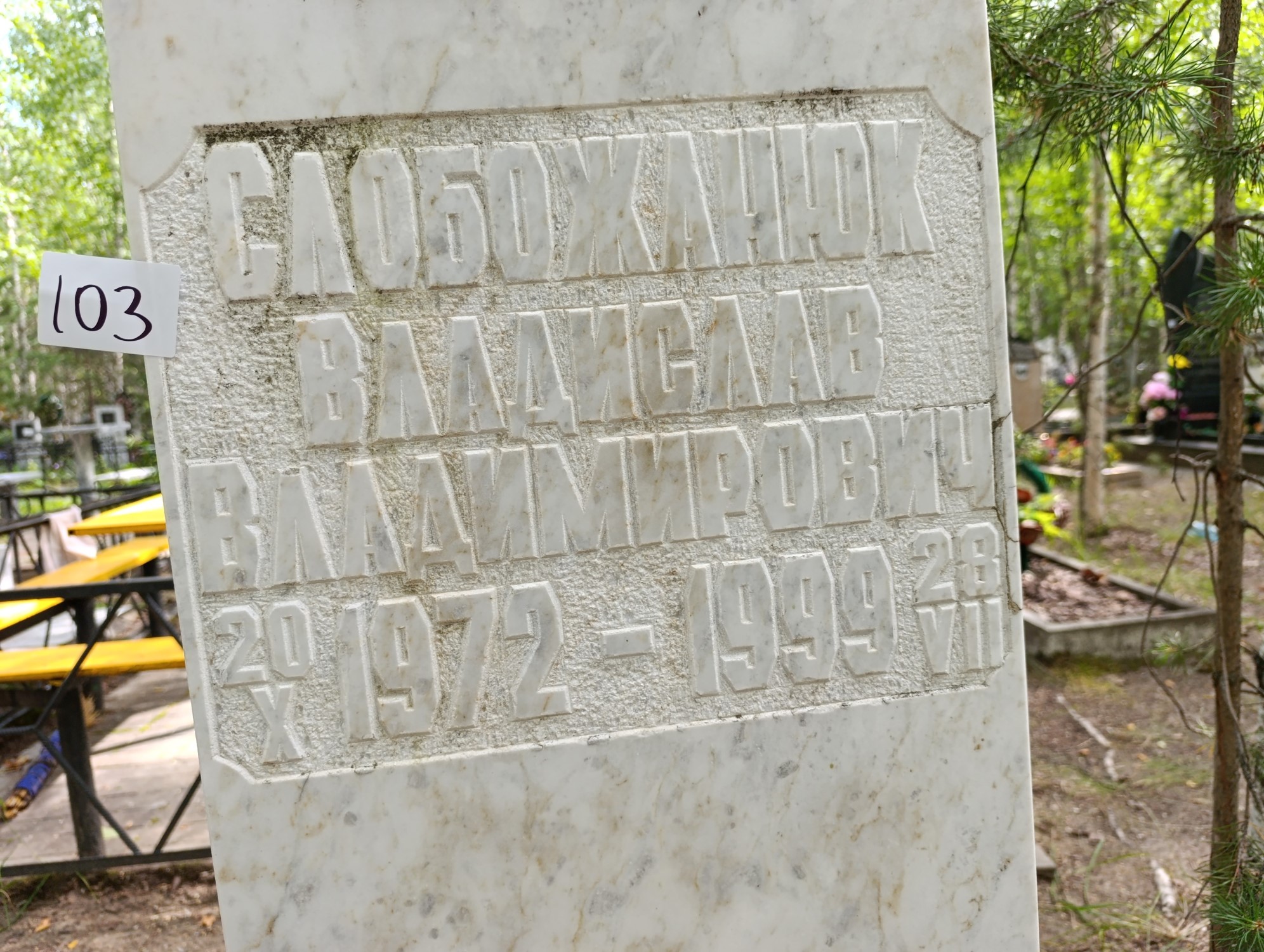 Дата рождения: 20.10.1972 Дата смерти: 28.07.1999 Наличие ограды: Нет Кладбище: Чернореченское II этап Секция кладбища: 9 Номер ряда: 1 Номер захоронения: 103 Вид захоронения: В землю Координаты: