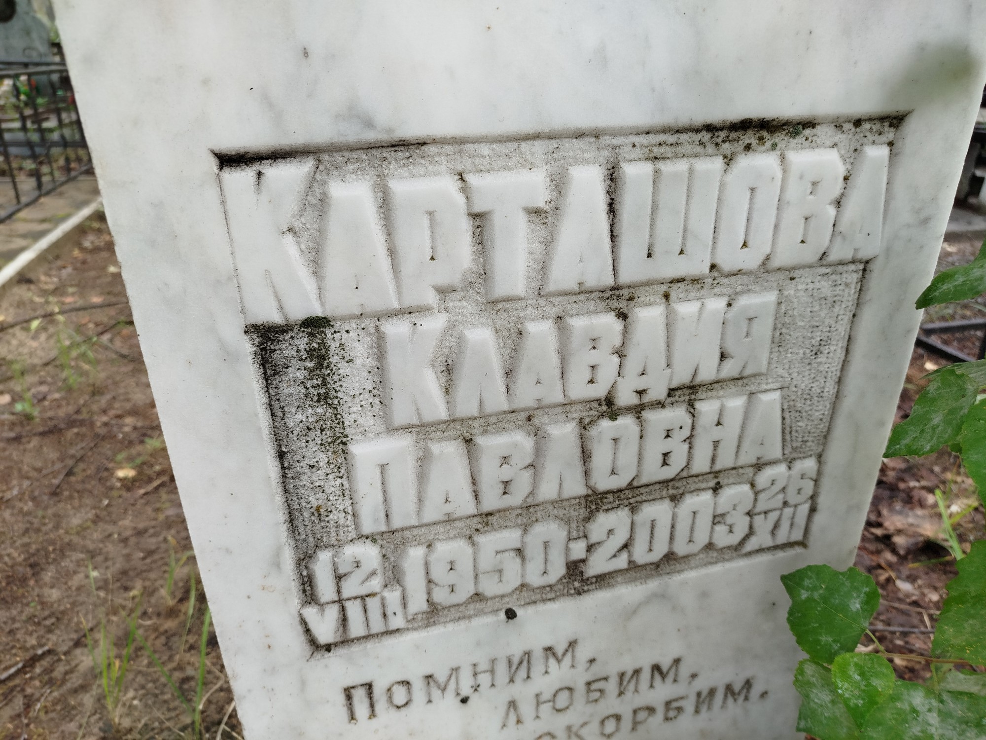 Дата рождения: 12.08.1950 Дата смерти: 26.12.2003 Наличие ограды: Нет Кладбище: Чернореченское II этап Секция кладбища: 15 Номер ряда: 1 Номер захоронения: 661 Вид захоронения: В землю Координаты: