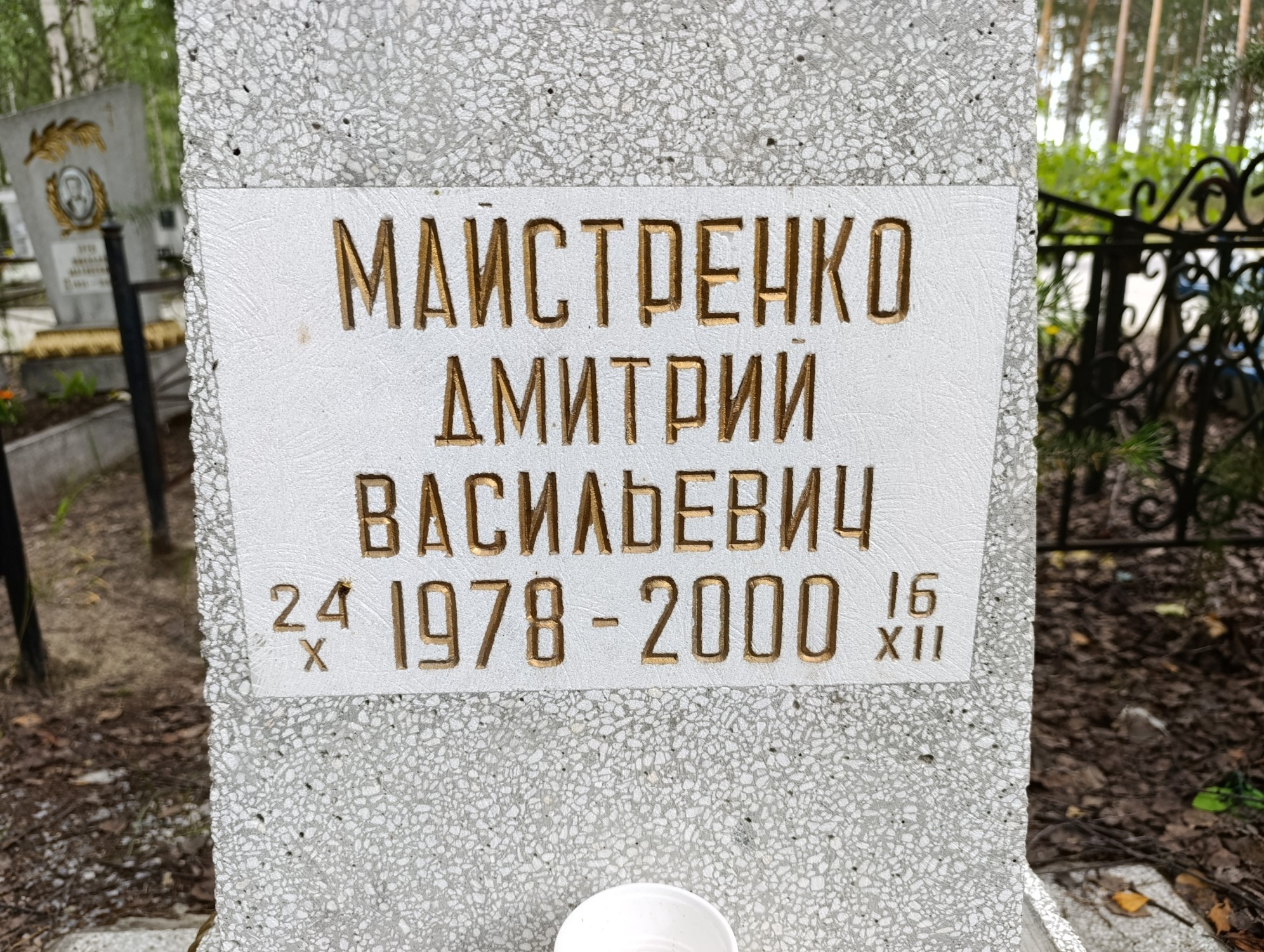 Дата рождения: 24.10.1978 Дата смерти: 16.12.2000 Наличие ограды: Нет Кладбище: Чернореченское II этап Секция кладбища: 12 Номер ряда: 1 Номер захоронения: 146 Вид захоронения: В землю Координаты: